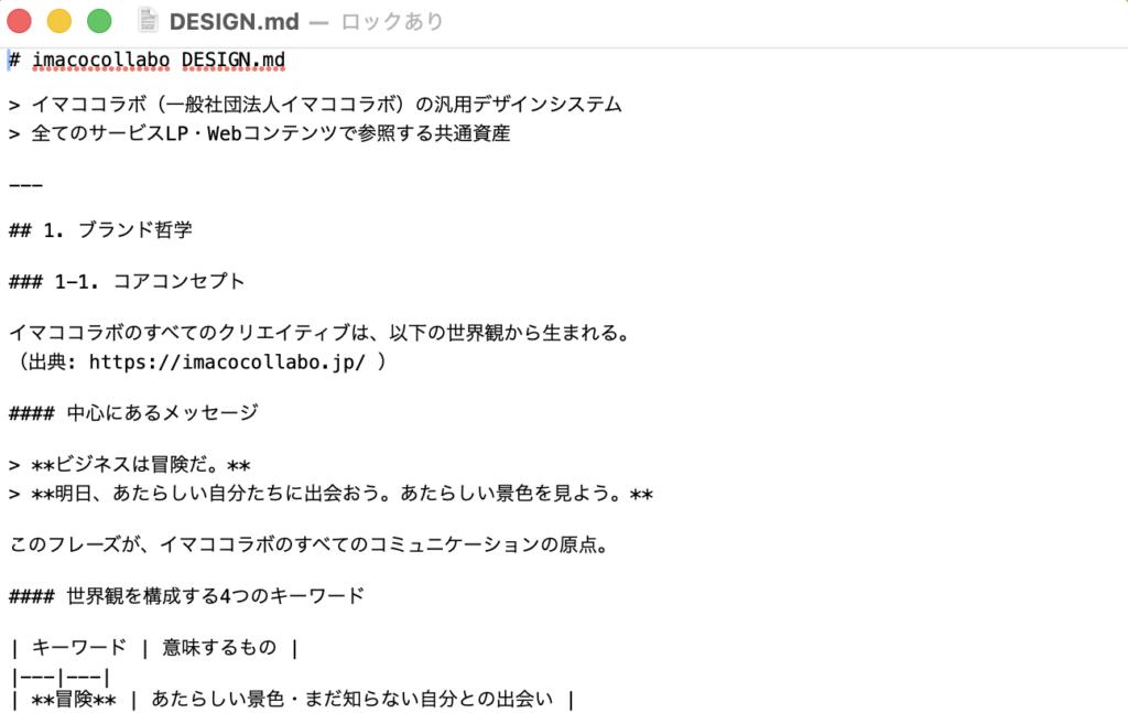 DESIGN.mdとは、ブランドのルールブックをテキストで書いたファイルのことです。色、フォント、トーン、コンポーネントのルールなどをひとつのMarkdownファイルに言語化する。これをAIに渡すことで、「このブランドらしい表現」をAIが理解できるようになります。YAMLという書き方で構造化すると、AIがより正確に読み取れる。