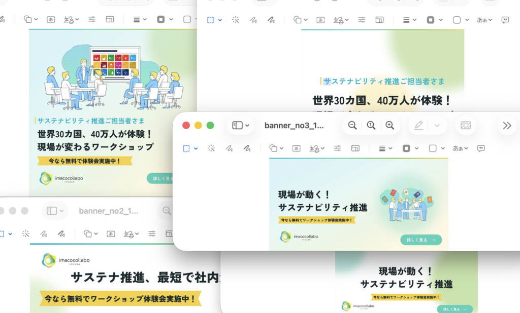 デザインの方向性と素材を渡して、ClaudeとPencilに指示を重ねていくと、10種類以上のバナーが2時間もかからずに出来上がっていきました。サイズ違い、訴求違い、トーン違い。「じゃあこのパターンも」と思いついたものをその場で試せる感覚は、これまでのやり方では体験したことがないものでした。