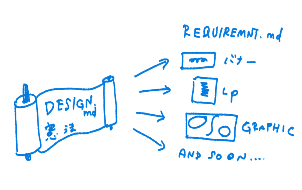 そして何かをつくる時にこのデザイン憲法「DESIGN.md」と、一つひとつの要件を書いた「REQUIREMENT.md」をつくると、ゼロからスクラッチで作ろうとしなくても、誰もがイマココラボらしいトーンを保ったクリエイティブが作れちゃう!ということ。