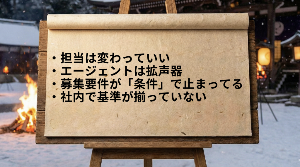 人事の担当者は「いい人」だと思っていても、現場の部長や役員は、同じように思っていない。このズレが続くと、エージェントは、「どんな人を紹介すればいいのか分からない」状態になります。