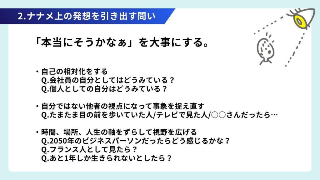 いな 問いを使って意図的に視座を変えることで、普段とは違う発想をし、答えを導き出すことができます。